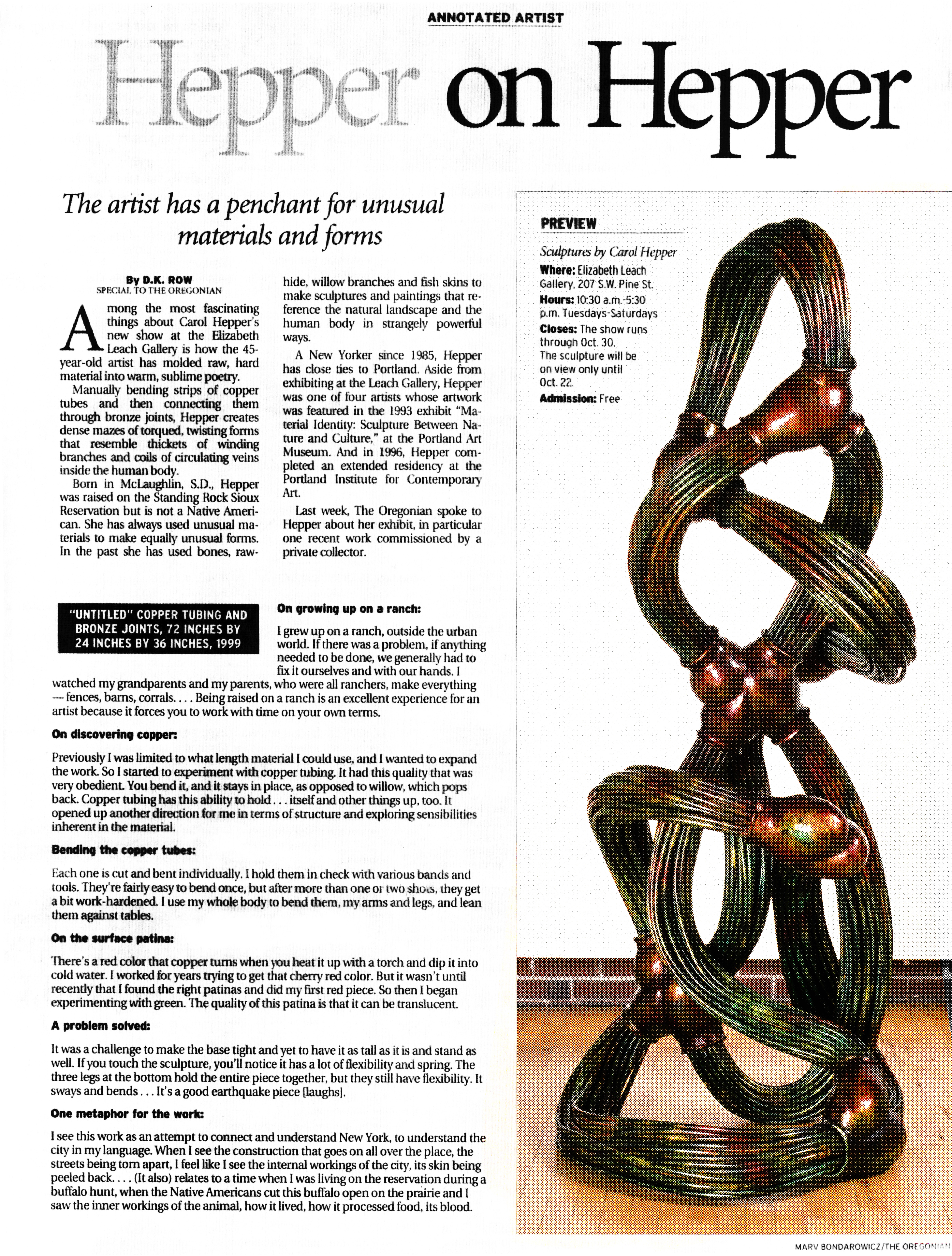Rosa Esman Gallery. Carol Hepper [cover title]. NY, 1991. Text by John Howell ("Spirit in Place"). Exhibition catalogue of chiefly large mixed-media sculptures (steel, rope, hide, industrial materials). In Howell's words, their "Constructivist process principles are punctuated by a visceral kind of High Plains visual language (Hepper grew up in South Dakota)."